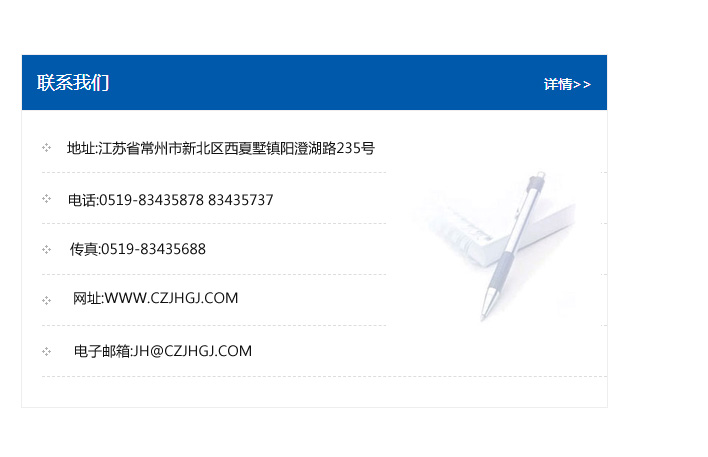 傳真:0519-83435688    郵編:213135    網址:WWW.czjhgj_com.qtdgjress.com    電子郵箱:JH@czjhgj_com.qtdgjress.com